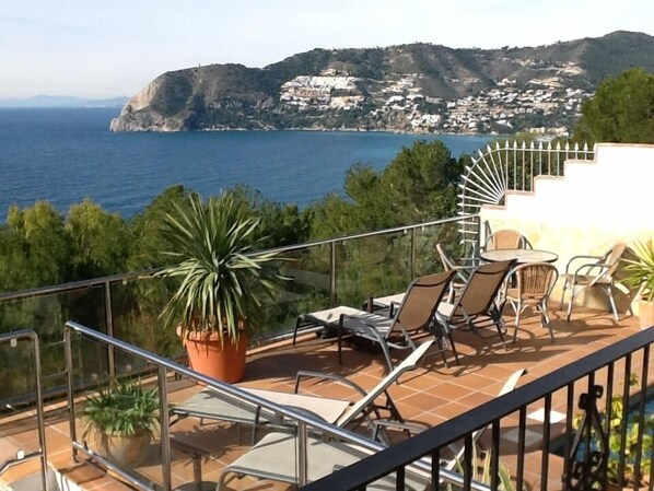 A spacious covered terrace/outside dining area overlooks the pool area with panoramic views both out to sea and inland to the mountains.