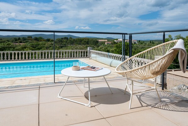 Spacious sun terrace with sun loungers, parasol and beautiful view of Pic Saint Loup