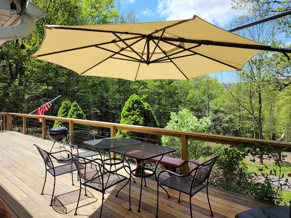Welcome to your perfect Catskills getaway! Nestled on a sprawling 5-acre lot, this serene home offers breathtaking mountain and forest views, just minutes from year-round outdoor activities. Located less than 8 minutes from skiing and only a short drive to fishing, swimming, hiking, shopping, and dining, this house promises both adventure and relaxation. Outdoor Features: Step onto the expansive wrap-around deck to enjoy panoramic views of the surrounding landscape. Whether you’re watching wildlife, grilling dinner, or simply reading a book while listening to the tranquil sounds of the nearby mountain creek, this outdoor space is ideal for unwinding. The deck is fully furnished with a large umbrella, two dining tables, chairs, and benches, perfect for gatherings. At night, cozy up by the fire pit in Adirondack chairs, with plenty of firewood provided for your enjoyment. The Space: This private three-bedroom, two-bathroom home comfortably accommodates your entire group. From the peaceful sound of the creek, which can be heard from both the deck and the second-floor bedroom, to the high-speed Wi-Fi (over 282 mbps) that covers the entire property, every detail is designed to ensure a comfortable and enjoyable stay. The home features thermostats in every room, and a wood-burning stove/fireplace with complimentary firewood to keep you warm on cooler days. For warmer months, window air conditioning units in the upstairs bedrooms and living room keep the space cool, though the large tree shading the house naturally maintains a pleasant temperature. Bedrooms: • First floor: One queen bed with fresh linens and blankets. • Second floor: Two bedrooms, one with two twin beds and the other with three twin beds. One of the rooms also includes a computer desk and office chair for privacy and remote work. Bathrooms: • First floor: Full bathroom with a shower, stocked with essentials like towels, soap, and shampoo. • Second floor: Luxurious full bathroom featuring a soaking tub and separate shower, complete with all necessary toiletries. Living Room: The cozy living room is perfect for entertainment or relaxation, featuring a Roku TV, 5-speaker stereo system, and a selection of board games. For colder days, relax by the wood-burning stove or enjoy indoor activities like electronic darts. A newly updated washer and dryer are available for your convenience, along with complimentary laundry detergent. Kitchen & Dining: The fully equipped kitchen has everything you need for meal preparation, including a large 4-burner stove with griddle, dishwasher, refrigerator, microwave, and a coffee maker with espresso, cappuccino, and iced coffee options. Complimentary coffee beans, spices, cookware, and utensils are provided. The dining room features a spacious table with ample seating for your group. Parking: Parking is available for two cars beside the house, with additional parking below the house just a short 50-70 foot walk away. Additional Information: Please note that the house is located on a private road, which may be a bit bumpy. However, we navigate it easily in our Hyundai Kona and wanted to give you a heads-up in advance. Come enjoy the natural beauty and tranquility of the Catskills while leaving your worries behind. This charming retreat is ready to welcome you for an unforgettable stay!