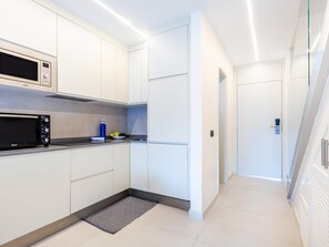 The apartment is spread over two floors and offers spacious and well-designed areas. On the lower floor, you'll find a modern and comfortable living roomwith a quality sofa bed, TV, and dining area. The open-plan kitchen is fully equippedwith everything you need: ceramic hob, microwave, fridge, kettle, coffee maker, and kitchenware. A full bathroomis also located on this level for added convenience.