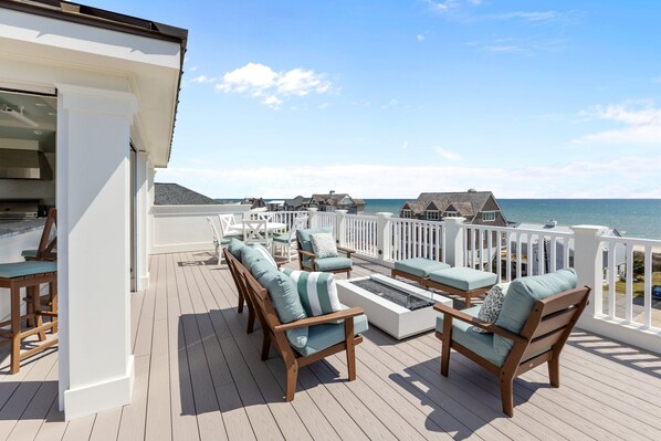Located in the exclusive Ocean Ridge community, this brand-new 4,800 sq ft home features a walk-up rooftop (850 sq ft) with expansive ocean and sound views. You'll feel like you're on top of the world looking across the ocean to Shackleford Banks or all the way across the sound into Morehead City. Stay in the shade inside the covered outdoor kitchen and bar where you'll find a beverage refrigerator, ice maker, sink with filtered water faucet, and an oversized grill. Want sunshine? Stroll out to the open decks and have a seat at the dinner table, gather around the fire table in the deep seating area, or enjoy a beverage at the pub table. The sunrises and sunsets are spectacular from this vantage point!
