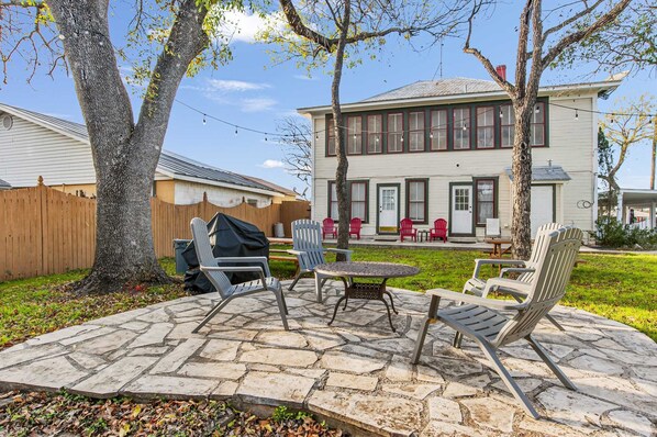 Behind the inn is an area shared with other guests. The back yard features a charcoal-fired BBQ pit for cowboy-style feasts, an outdoor fireplace around which you can share stories, and plenty of furniture. String lights give your nighttime activities a special sparkle. The shaded porch up front is furnished with Adirondack chairs, a porch swing, and a great view of a vintage Wild West-era carriage on the property. Small, well-behaved dogs are allowed at this pet-friendly and kid-friendly rental. First-come, first-served covered parking is provided for the inn rooms, and additional street parking is available.