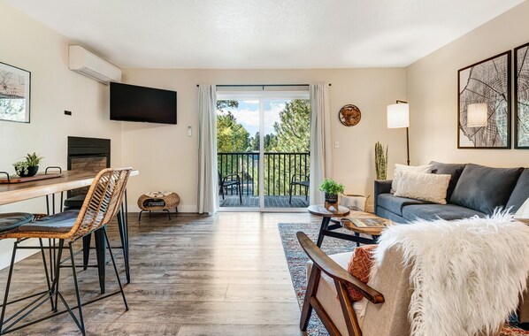 Look no further, this recently updated condo right in the heart of Bend is what you've been searching for! This condo sits on the top floor, giving you the best views of the park right across the way, as well as ensuring you will never hear footsteps walking around above you! The owners of this condo recently spent some time updating it with many beautiful and custom modern furnishings and decor that will have you feeling right at home! Inside, you'll be greeted with hardwood-like flooring and an array of comfortable furniture for relaxing. In the living room, you will find a brand new couch which turns into a sleeper sofa, a beautiful dinette table with seating for four and a flat screen TV to curl up and watch your favorite movies on after a day of exploring all of the amazing things Bend has to offer! This condo comes with it's own private high speed wifi so you don't have to worry about dodgy signals or streaming services cutting out! Not a movie person? This condo has a beautiful gas fireplace in the living room for cuddling up with a cozy blanket and watching the fire!
