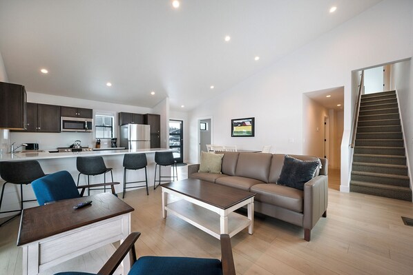 The two story Townhome style units are tastefully furnished with three bedrooms and a “bunk” room, two full baths and a half bath, accommodating up to twelve guests (8 adults max) suitable for families, groups of friends, or couples. Offering a fully equipped kitchen, the dining table accommodates six people, offering four chairs with a bench, and four bar stools at the counter. A lovely living room that offers a sliding glass door out the private patio is all included in the open concept living area. This area is ideal for entertaining and spreading out. Retire to the bedrooms after a long day of adventure, and peacefully dream about the next day's adventures. The Master Bedroom has a king-sized bed, as well as Bedrooms 2 and 3. The Bunk Room offers 2 sets of bunk beds with a twin bed up top (sleeps 1) and a full-sized bed on bottom (can sleep 2). The bathroom upstairs has both a shower and a tub, and serves Bedroom 1 and the Bunk Room. The full bathroom downstairs is located between Bedrooms 2 and 3, provides access from either room, and has a luxurious walk-in shower (handicapped accessible). The half bath is located adjacent to Bedroom 3 and the Family Room, and access is provided from either room, providing the guests in Bedroom 3 a private toilet during the night. The townhouse has centralized heating and AC, offers a stacked washer and dryer in the unit. The Townhouse is also child friendly. The patio off the sliding glass door offers a barbecue grill and spectacular views of the Swan Range and Jewel Basin! Enjoy having Barbecues with your friends or family while relaxing while having a refreshments on the patio. The communal area provides additional barbecues and a large gas fire pit in the central courtyard. Guests are also welcome to use the common coin operated laundry machines. It is Located on the lower level of the building. Laundry area has electronic lock and is open 24/7.