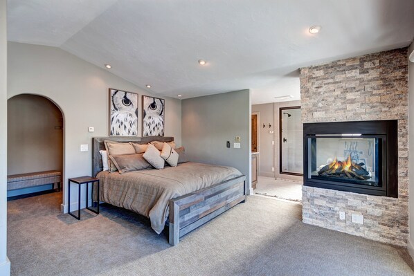 マスターベッドルーム1:キングベッド、薄型テレビ、深めの浴槽と独立したスチームシャワー付きの専用バスルーム