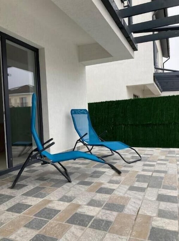 Outdoor terrace and yard with outdoor chairs to sunbath.