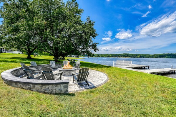 Lakefront retreat with a large yard, stone fire pit, gazebo, deck, & dock