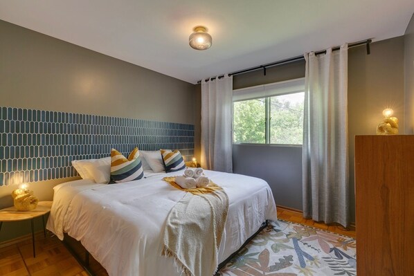 Bedroom 1: King-sized bed with a large closet, dresser and large window.