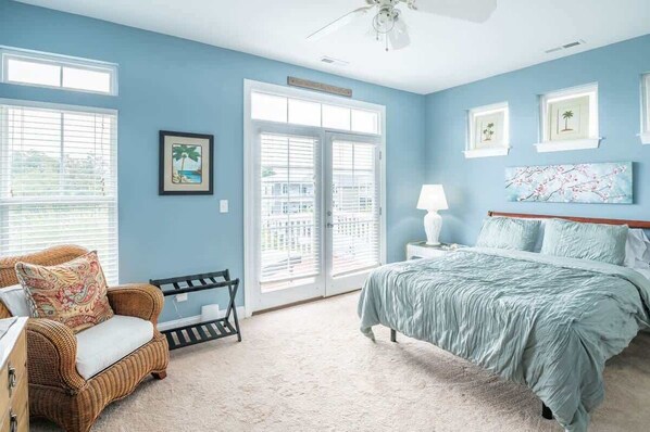 Primary Bedroom Suite: Private sun deck, queen size bed, 40" TV, side chair, ceiling fan, Ensuite bathroom with double vanity and a shower/tub combo.