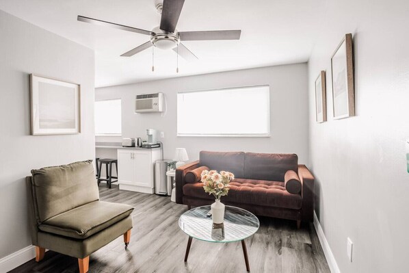 Walk into the cozy living room with comfortable couch & seating. High speed 250Mbps fiber Wifi for work & streaming. Open living room has a 55` Smart TV for all your streaming. The newly renovated kitchen has Dawn, Keurig and kcups, and stocked with cooking essentials for you to use!