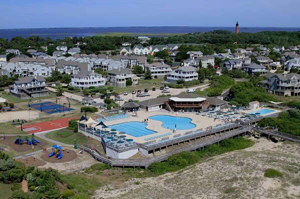 In Corolla Light, Hook, Wine, and Stinkers offers a perfect summer getaway with resort pools and beach accesses. Take a short walk to restaurants or the coffee shop without getting in your car. Enjoy community activities in the summer and numerous nearby attractions like shopping, dining, historical sights within walking distance.