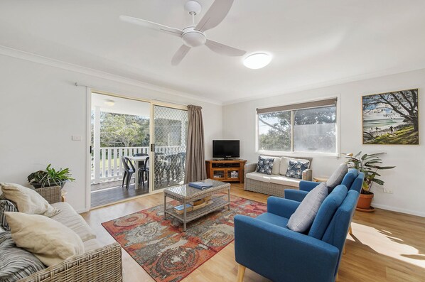 Spacious, and thoughtfully designed for functionality with upstairs providing 2 well-appointed bedrooms, fully-equipped kitchen, contemporary bathroom, and newly furnished open plan dining and living area flowing onto a full-length timber deck balcony. Perfect for entertaining on those summer afternoons with a beverage after a day amongst the waves. Complete with TV, DVD and Wifi, you will have everything you need to keep the family entertained on quiet days.