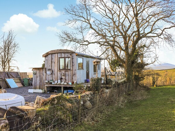 Shower Room: Cubicle Shower, Heated Towel Rail, Toilet. LPG central heating and underfloor heating, gas, electricity, bed linen, towels and Wi-Fi included. Hot tub for 4 (private). 2 pets welcome (£20 per pet, payable on arrival) to be kept on a lead at all times (sheep country). Bike store. Electric vehicle charging point, at cost. Private parking for 2 cars. No smoking. Please note: This property is accessed via a rough track. This property has a security deposit of £150.. Nestled amidst the rolling hills of Ymlwch, just 3 miles from the charming town of Criccieth, sits a picturesque shepherd’s hut that epitomises rustic charm. Surrounded by verdant countryside, this idyllic retreat offers breathtaking views of the Welsh landscape and promises a serene escape from the bustle of everyday life. The shepherd’s hut, crafted locally, exudes rustic charm and modern comfort in equal measure. A private hot tub, nestled overlooking the sweeping vistas, invites guests to unwind and soak in the tranquillity of their surroundings.