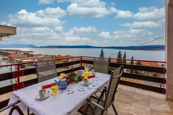 Renovated flat with sea view, fitness room, baby cot, barbecue area