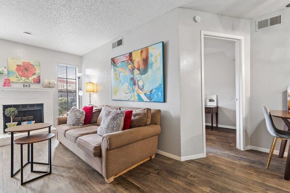 Welcome to this cozy 1 bedroom apartment in Richardson, North Dallas, with a patio facing the shared pool area. Enjoy free WiFi and Smart TV features while relaxing on the couch or cooking in the fully equipped kitchen. Take advantage of convenient access to FWY 75 & 635 for easy commutes.