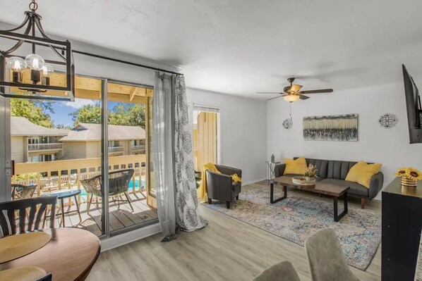 This is a UPSTAIRS (Two Flights of Stairs) newly renovated one bedroom, one bath condo- featuring a queen bed in the bedroom with a Smart TV where you can connect all your favorite streaming services (YouTube TV is Connected) with FAST fiber optic WI-FI! The living room features a couch that converts into bed (two kids or one adult) and an ottoman that converts into a twin bed, Smart TV, kitchen table, and work station. The fully stocked kitchen has a Keurig coffee maker, Cookware, brand new stainless steel appliances which includes a stove, microwave, refrigerator, and dishwasher. The bathroom has a full size washer/dryer and large garden tub/shower. Sit on the back balcony that overlooks one of the communities pools that is open year round! The condominium complex features two pools which are open year round.