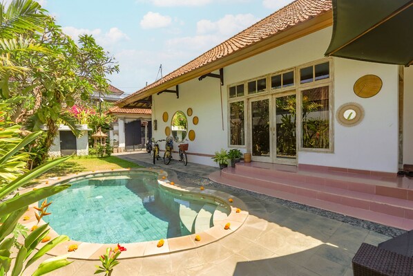 Salsala 3 Bedroom Balinese summer house, nestled in central Sanur, invites you to unwind in its serene atmosphere. Its strategic location allows easy access to Sunrise Beach Sanur with the use of push bikes provided. Enjoy a refreshing dip in the pool and bask under the warm sun.