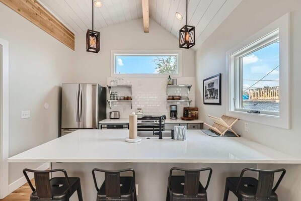 From an open concept layout to beautiful hardwood floors, no detail has been overlooked in this newly constructed, above garage guesthouse to ensure your visit is comfortable. This space boasts a gorgeous full kitchen with stainless steel appliances and is fully stocked with stylish wares for those looking to make a home-cooked meal. After a day of exploration, hop in the luxurious shower with a gorgeous stained-glass window for a splash of character and natural light while maintaining your privacy.