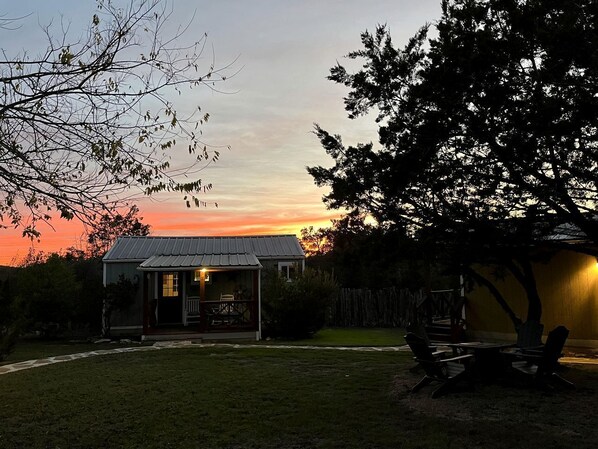 Outside, there's a charming front porch with seating, a great place to enjoy a cup of coffee in the fresh air. OR, enjoy the firepit table or a swing on the courtyard under this big starry sky.