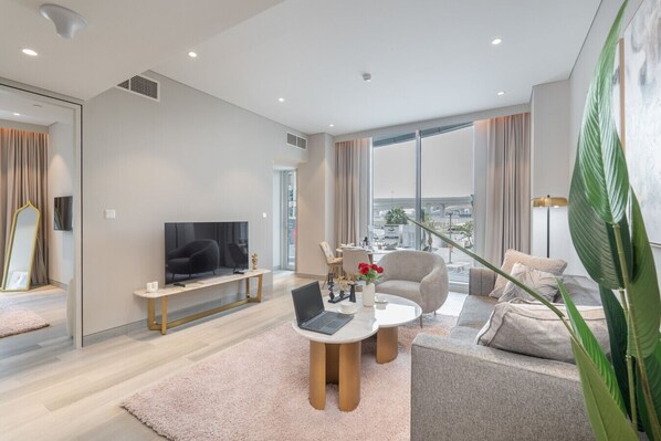 Key features: -349J+CHW - Al Marsa Area - Al Seba St - Dubai Marina -10th floor -1 bedroom apartment that sleeps3 -Free Gym -Swimming pool -Grocery store, retail, and restaurants within the building -Direct Dubai Marina access from the building -Dubai Eye, Blue Waters Island 10 min taxi -The Walk, Jumeirah Beach 15 mins walk -Dubai Marina Mall 5 min taxi -Free private parking space -Public transport tram 5 min walk -Free WIFI -Check-in: 3 pm onwards -Check-out: By 11 am -Cots and highchairs are available on request