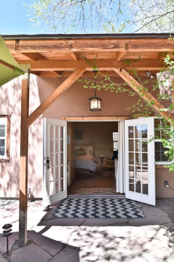 Escape to Bucking Mule Guest House in downtown Durango, Colorado. Enjoy a private 800 sf courtyard with BBQ, patio furnishings and a beautiful outdoor eating table. Inside, unwind in the Japanese soaking tub or walk-in travertine shower.