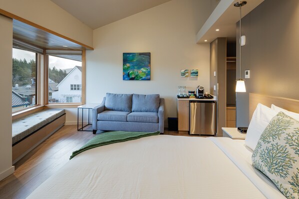 Escape to Orcas Island, WA and unwind in Luxury King Hotel Room's peaceful ambiance. Enjoy a partial water view of Eastsound Bay from your room's 8-foot window seat or relax by the 48-inch electric fireplace. With heavy sound insulation and blackout curtains, rest assured you'll sleep soundly on the plush Simmons Napa Black King Bed.