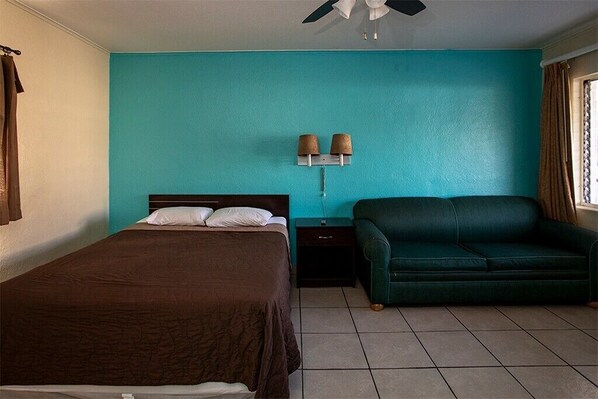 So much potential! Cute and 60's feeling with all the tile. That lovely blue wall needs a manatee or dolphin or something painted on it! There was no coffee table, so surface area was really limited. It would be nice if the floor was cleaned more often while I was there (there were a few dead bugs that accumulated).