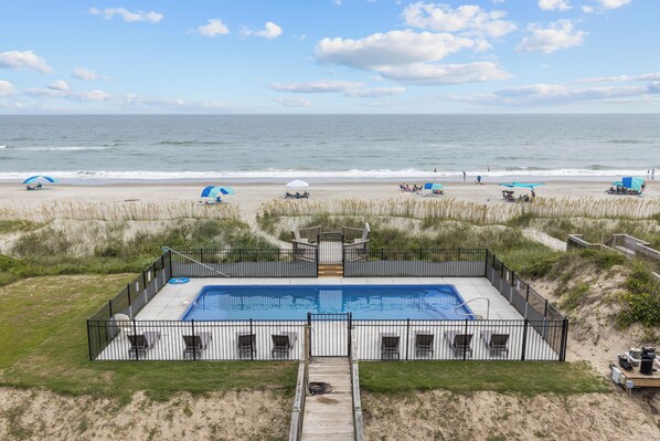 Enjoy your morning coffee from the three balconies that overlook the panoramic Oceanview. The well-equipped spacious kitchen with an oversized pantry makes family dinners a breeze. A large dining room table for gathering or great for playing games. New gas grills and large picnic table offers lots of opportunities to take in the sounds, smells and views of the calming ocean.