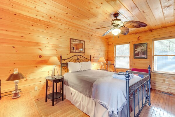 ピースフルキャビンw/ホットタブ:ブルーリッジまで11マイル!の客室は冷房付きで、暖炉やアイロン / アイロン台をご利用いただけます。この 3 つ星コテージには、コンロ、電子レンジ、調理器具と食器、食器洗い機を備えたキッチンがあります。 バスルームには浴槽またはシャワーがあります。
