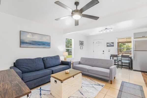 Welcome to one side of our freshly remodeled duplex, designed to accommodate up to 6 guests. With 1 bedroom and a loft featuring a Queen bed (bedroom), 2 Twin Beds (Loft), and a pullout couch in the living room, everyone will have space to unwind comfortably. Located in the heart of downtown Foley, you'll have access to plenty of late-night food delivery options and dining spots. Centrally positioned to various local attractions, here are some distances in miles as times may vary due to seasonal traffic.: