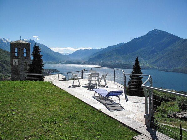 2-room apartment 45 m2, on the ground floor, east facing position. Bright, practical furnishings: living/sleeping room with panoramic window east facing position with 1 double sofabed, dining table and satellite TV. Exit to the terrace. 1 room with 1 french bed (160 cm). Open kitchen (oven, dishwasher, 4 induction hot plates, toaster, freezer, electric coffee machine). Shower/WC. Gas heating. Terrace partly roofed, lawn. Terrace furniture, deck chairs (2). Marvellous panoramic view of the lake and Monte Legnone (2609 m). Facilities: children's high chair, baby cot for up to 2 year olds. Internet (WiFi, free). Parking (1 car). Please note: non-smokers only. Private entrance. IT013249C2K525JWVT