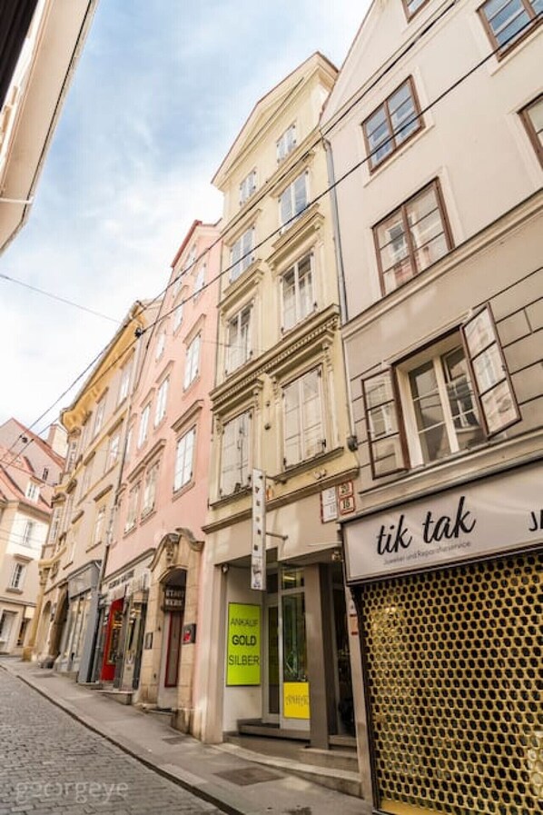 The apartment is located in Sporgasse, a street i older than Graz itself. Already in Roman times a trade route between the Murtal and the Roman province Colonia Claudia Savaria ran here. Today, Sporgasse is one of the main pedestrian and shopping streets in the city. In hardly any other street can you read the architectural history of Graz as well as in Sporgasse. At the corner of the main square is the baroque Luegg house with its mighty facade and the arcade. Opposite is an Art Nouveau building with floral decorations and medallions with women`s heads, some in gold. A little further up is a baroque building, whose large portal shows a riding image of St. John of Nepomuk.