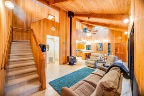 Redwood Retreat is your serene escape in the heart of towering redwoods. Start your day with morning coffee on the wraparound deck, then cozy up by the wood-burning stove and enjoy a night in with free WiFi, a DVD player, and board games.