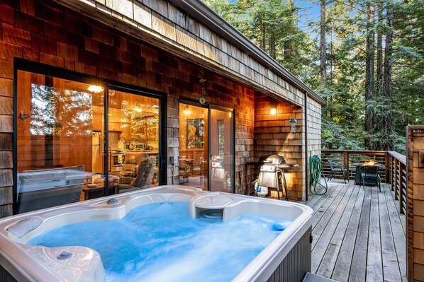 Forested home with hot tub, deck, gas grill, fire table, & wood-burning stove