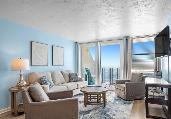 THE SPACE: Enjoy this updated condo nestled right on the beach. The living room is spacious and comfortable with a slider to the balcony. The kitchen is fully stocked with both a Keurig and regular coffee makers. For dining, there is room for 6 at the table and 4 at the kitchen bar. The master bedroom has an ensuite full bath with a tub/shower combination. The second bedroom hosts the stacked washer and dryer. The third bedroom has bunk beds for the little ones. The second bath in the hall features a tub/shower combo. There are smart TVs in the living room and all bedrooms. Please note that the TVs in the unit are Smart TVs. Cable is not included and guests will need to login to their own streaming/cable services through the TV's many apps. Wi-Fi and cable are complimentary!