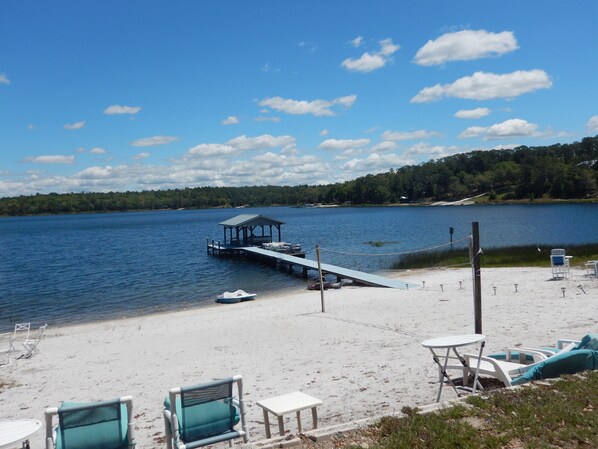 Relax at this tranquil retreat and wake up to sunrises over the lake. Enjoy your coffee on the balcony, play, fish, kayak or paddleboat on the private beach & dock. With a well-equipped kitchen and BBQ grill options available for dining in - also nearby fine area restaurants within reach.