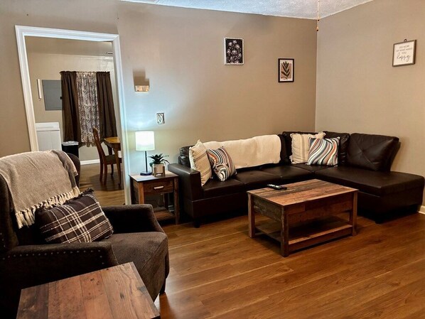 Our newly renovated trail house sleeps up to 5 people and has central air and heat. We have 2 bedrooms. Each room has its own smart TV. Linens, extra blankets, and pillows are provided. There is one full bathroom. Shampoo, Conditioner, Body Wash, TP and Towels are provided. You will also find a large eat-in kitchen with full-size appliances, including a dishwasher, microwave, toaster, and coffee maker. Coffee creamer, sugar, trash bags, dishwashing soap/pods and paper products are provided. The cabinets are fully stocked with all the plates, glasses, pots, bowls, utensils, etc., that you should need to prepare a meal for your group. The living room has a comfy leather sofa a Smart TV with over 200 free channels, or sign into your own streaming accounts! Our laundry room has a washing machine and a dryers (detergent provided). The exterior of the home, including the parking area, has security cameras.