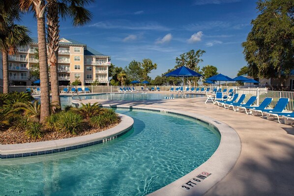 Located on Hilton Head Island, Bluewater Resort & Marina offers a luxurious retreat with endless activities. Enjoy the largest pool on the island, an outdoor feature pool with a lazy river and kids' splash pad, as well as kayaking and fishing from the private dock. Relax in your fully equipped condo with granite countertops or unwind at the sauna and spa tub.