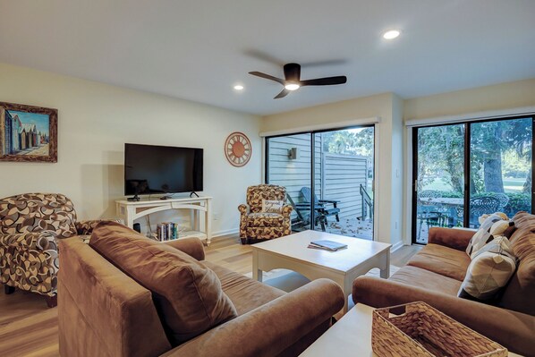 Your Hilton Head getaway starts here! Perfectly situated between the gorgeous island beach and The Greens community pool, this fully renovated townhouse villa features a modern kitchen, granite countertops, and a bright living room with stunning golf course views. Enjoy 3 large smart TVs, free Wi-Fi, and a sleeper sofa for extra guests. The primary suite offers a king bed and spa-style walk-in shower, while the guest bedroom includes a queen bed and access to a second updated full bath. Laundry room conveniently located upstairs. With bike rentals and beach gear included, exploring Shipyard is a breeze — beach, golf, dining, and scenic trails are all moments away. 116 The Greens is professionally managed by Hilton Head Vacations, Inc. Book today and enjoy the ultimate island escape!