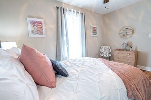 Bungalow on 8th, nestled in a historic district near Downtown Decatur, offers the perfect blend of comfort and style. Unwind in the cozy living space with plush leather sofa and indoor fireplace or step outside to enjoy fresh air on the covered patio. With modern kitchen appliances, comfortable bedrooms featuring queen-size memory foam mattresses and luxurious linens plus an inviting workspace for productivity.