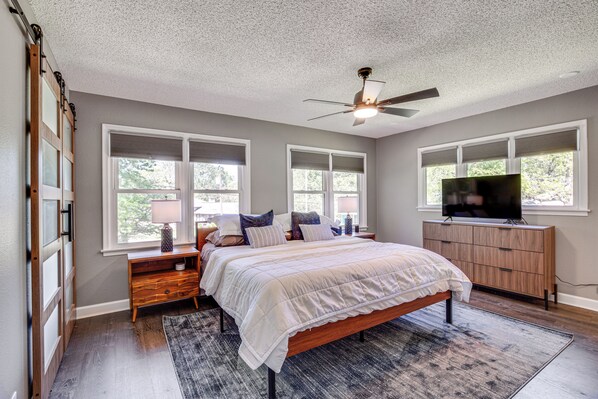 INDOOR LIVING: Smart TVs, laptop-friendly workspace (w/ docking station, monitor, & HDMI cable), fireplace (starter bundle of wood provided), dining table, breakfast bar, ceiling fans