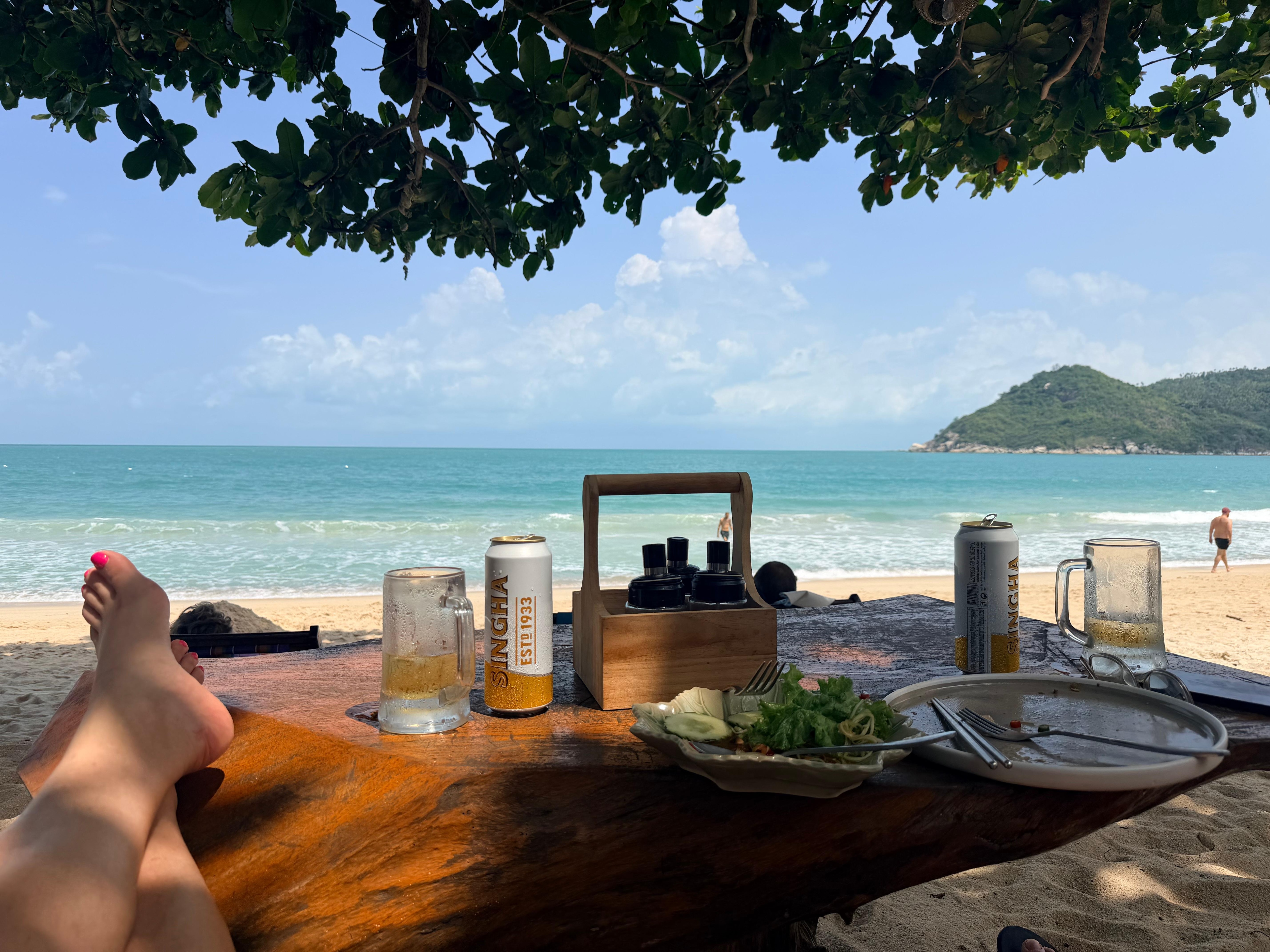 We stayed here for two nights over new years to head to the FMP, it was about 300 baht ew pp for a taxi there and also about 300 baht pp to the pier - but it’s much nicer than staying in Haad Rin if you’re a couple. And the beach makes it also worth paying that bit extra for!