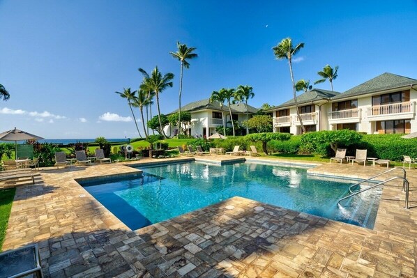 Our ocean front spacious condo in the heart of Poipu beach next to theSheraton Hotel has it all! This beautiful condo has unobstructed ocean views from the living room and master bedroom. It is very spacious with over 1,800 square feet of living space with two bedrooms upstairs and 3 full bathrooms and a beautiful remodeled kitchen with everything to cook a gourmet meal. It's just a short walk to the beach and access to a pool with ocean views. This resort also offers tennis courts.