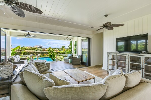 • Great room design with indoor/outdoor living room, flat screen TV, sonos sound system