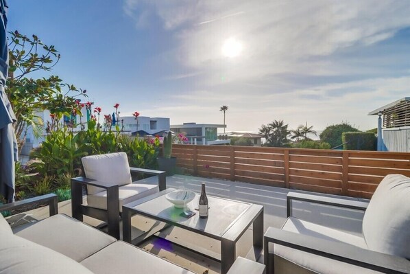 With a large open living, dining, kitchen area you can relax after a day at the beach or exploring La Jolla. The chef's kitchen is equipped with everything you need for a gourmet dinner or a simple bar-b-que on the patio. The home features both a dining table and counter seating. The living room features an oversized couch and chairs for simple relaxing or enjoying a movie.