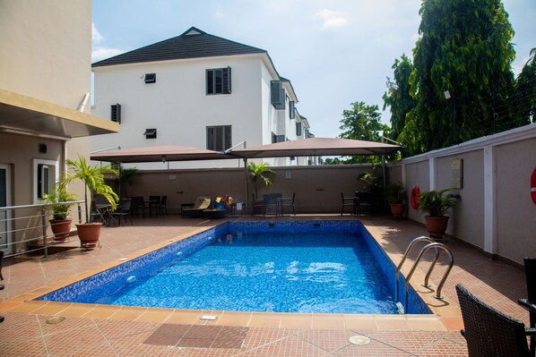 Amber Residence offers a quiet haven in Ikeja. Relax in the garden or enjoy the pool with drinks from the bar. Near Computer Village, ideal for business needs, with high-speed WiFi and multilingual staff supporting all travelers.