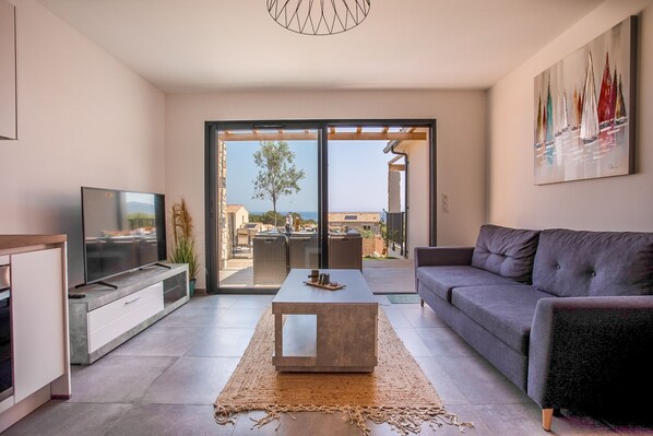 - A living room of 32 m² with a double sofa bed and TV, Wifi included