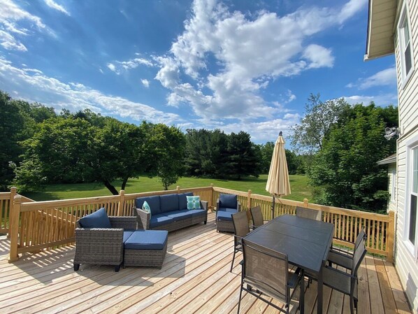 Additionally there is a three seasons front porch and a large back deck that overlooks the beautiful yard. The deck has lounging and dining furniture in spring through fall. There is also a fire pit for use and a propane grill for those gorgeous country nights.