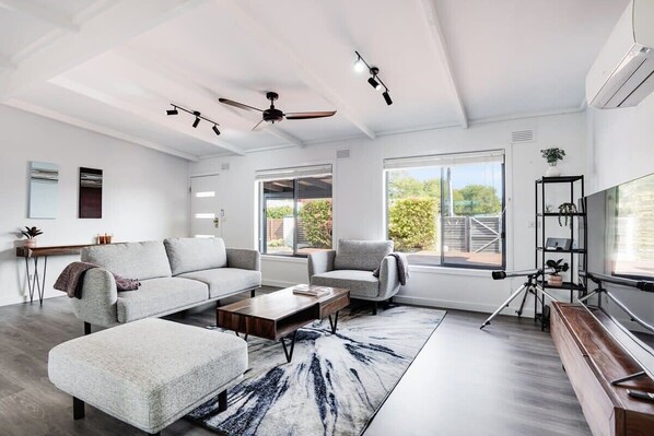 The indoor space is just as impressive with white tones and clean, crisp lines complemented by quality, contemporary finishes including sleek matte black bathrooms fittings. A light-filled living room includes split-system heating/cooling for year-round comfort and adjoins a generous kitchen/dining area with stainless-steel appliances and plenty of cupboard space.