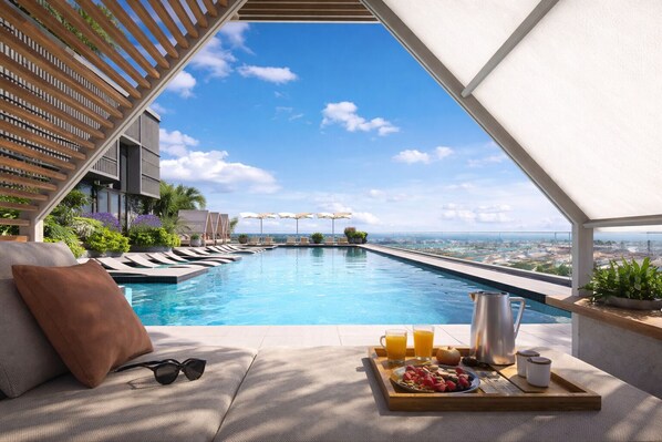 An outdoor pool along with sun loungers